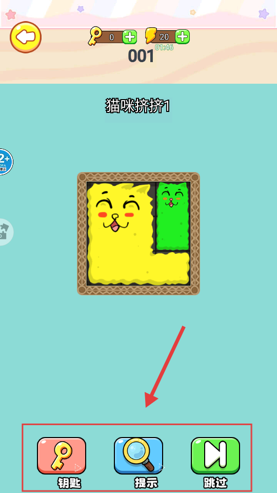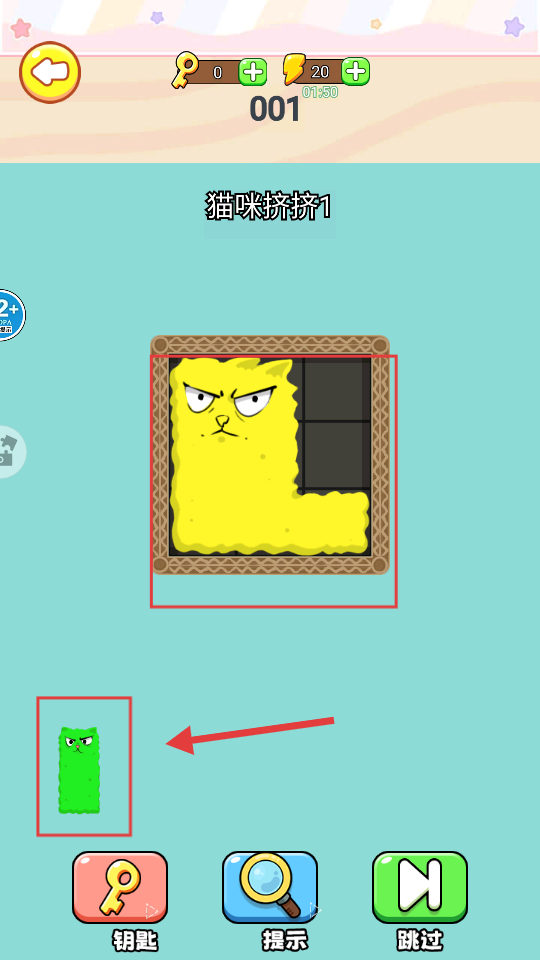 2、关卡内找到左侧【绿色-小猫咪】,按箭头提示拖动到上方黄色猫咪右侧空位。