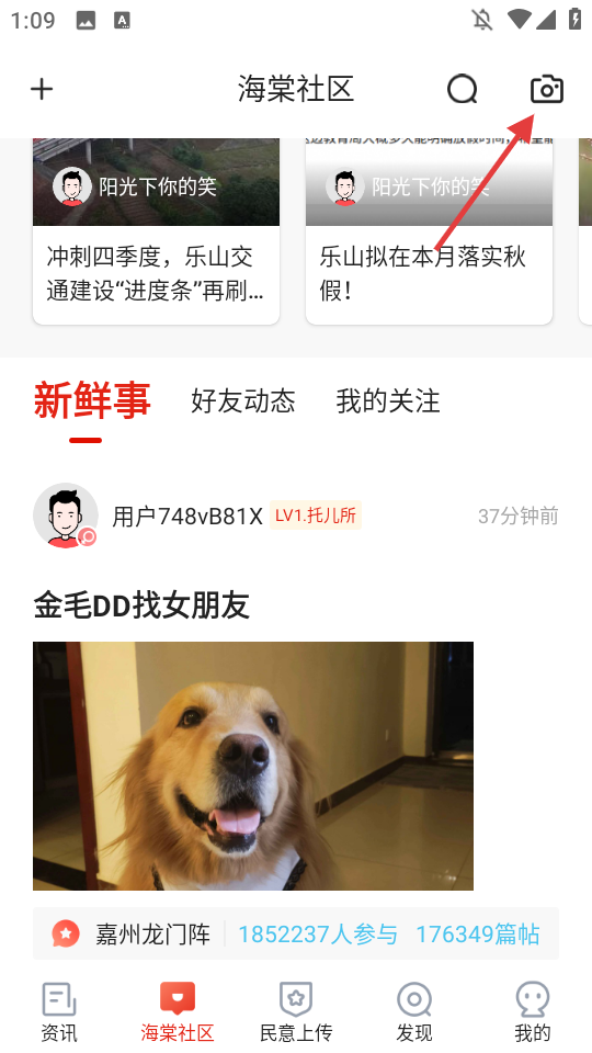 2、点击右上角相机图标,进入【新帖】发布页面。