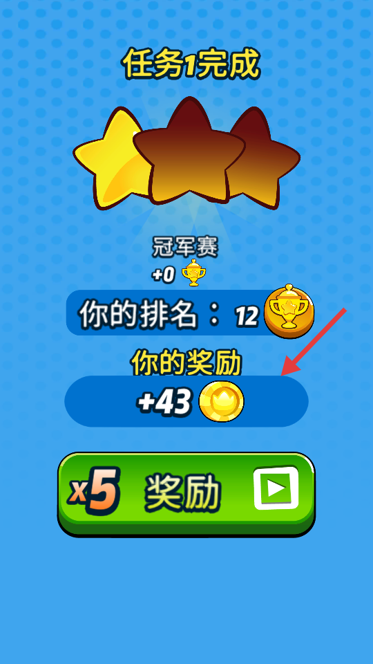 4、完成“任务1”后,界面显示排名与奖励,可获取金币。