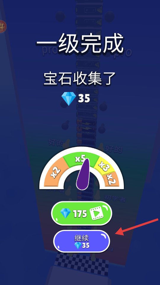 4、“一级完成”后,可获取宝石等奖励,点击【继续】按钮进入后续关卡。