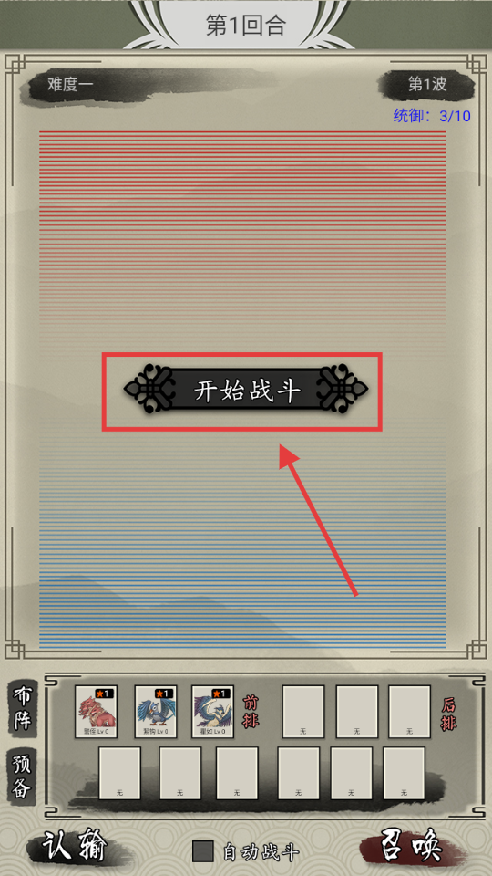 1、先在布阵栏放置初始神兽,确认后点击开始战斗进入第一回合第一波对战。