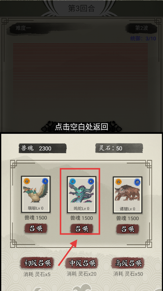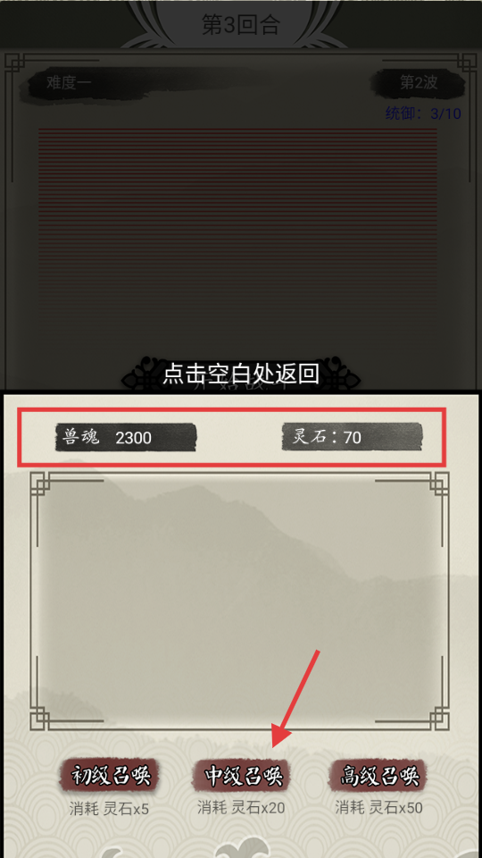 2、查看当前兽魂和灵石数量,根据灵石消耗选择中级召唤消耗二十灵石来获取新神兽。