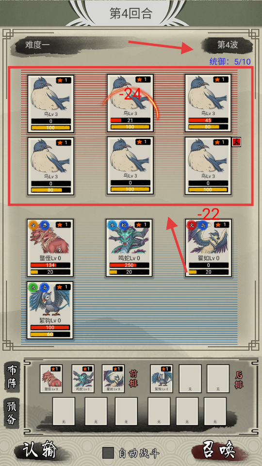 4、应对第四波敌人时,注意上方敌人的血量和伤害数值,及时调整己方神兽站位避免减员。