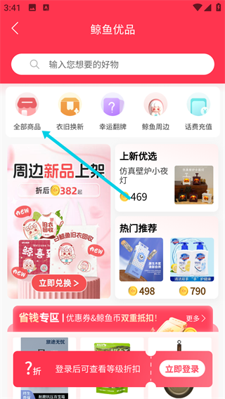 2、进入【鲸鱼优品】页面后,点击【全部商品】,这里有丰富换购好物,任你挑选。