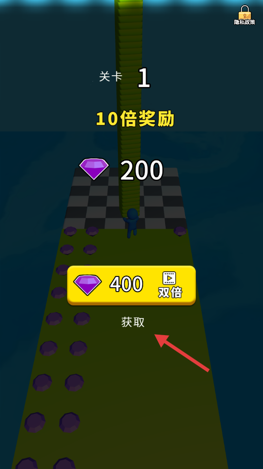 4、到达“关卡1”终点,可获200钻石“10倍奖励”,也能看视频拿400钻石双倍奖励。