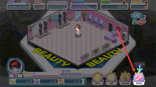 2、在美容店界面,点击管理道具选项,打开道具与装扮的选择界面。