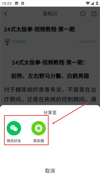4、弹出分享选项,可选择【微信好友】或【朋友圈】分享该健康内容。