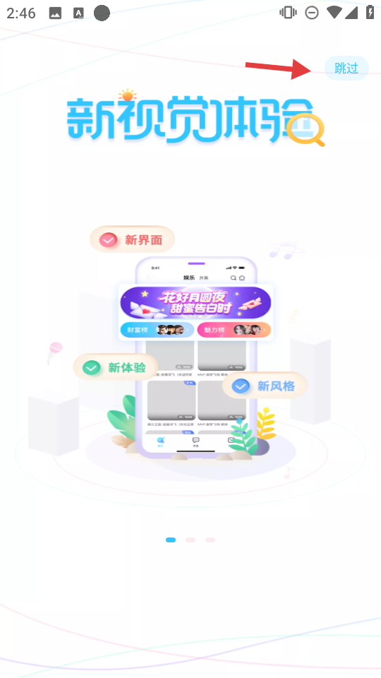 1、进入引导页,了解【新界面-新体验-新风格】,或点击【跳过】直接进入应用。