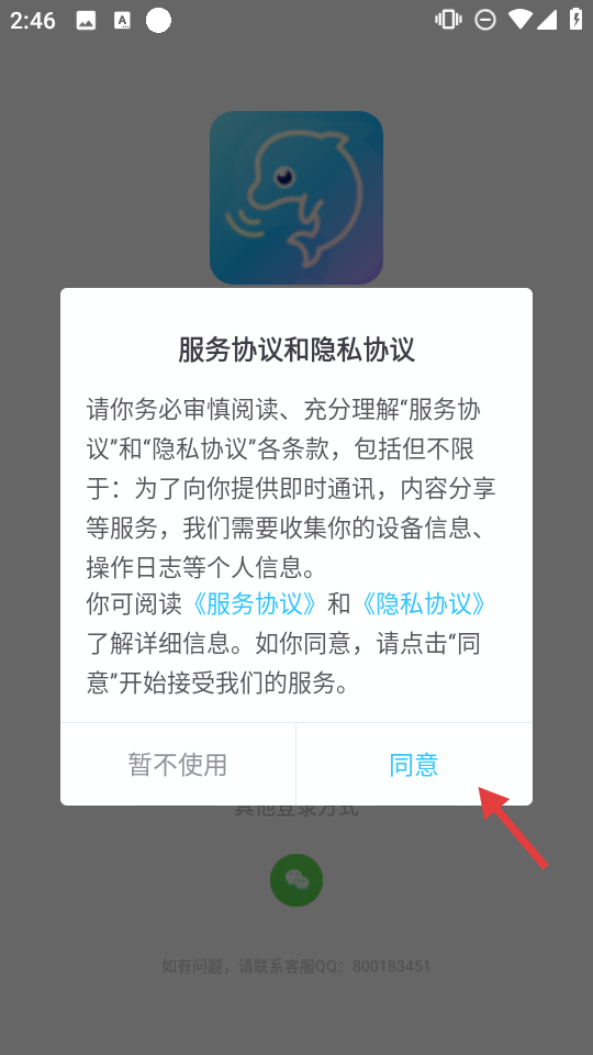 2、阅读【服务协议】和【隐私协议】,点击【同意】,授权应用使用服务。