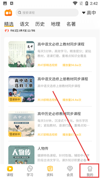 1、在界面底部找到【我的】按钮并点击,可从课程展示页进入个人功能相关页面。