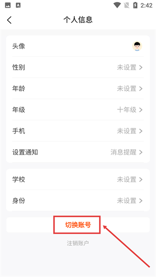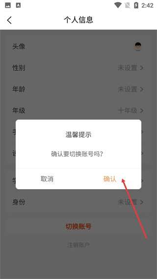 3、在个人信息页面中,找到下方的【切换账号】按钮,点击该按钮可触发账号切换的确认提示。
