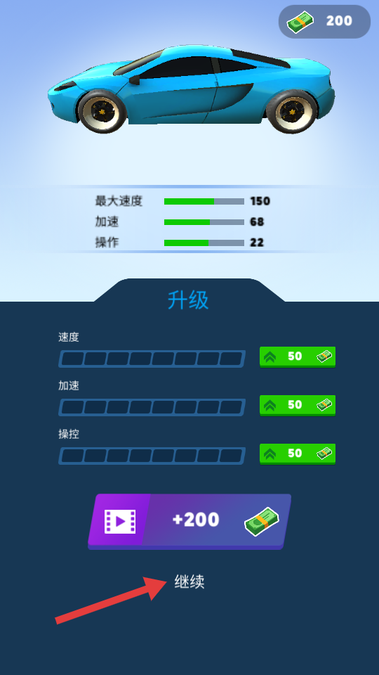 4、比赛结束后点击【继续】,可升级车辆速度、加速、操控等属性,提升赛车性能。