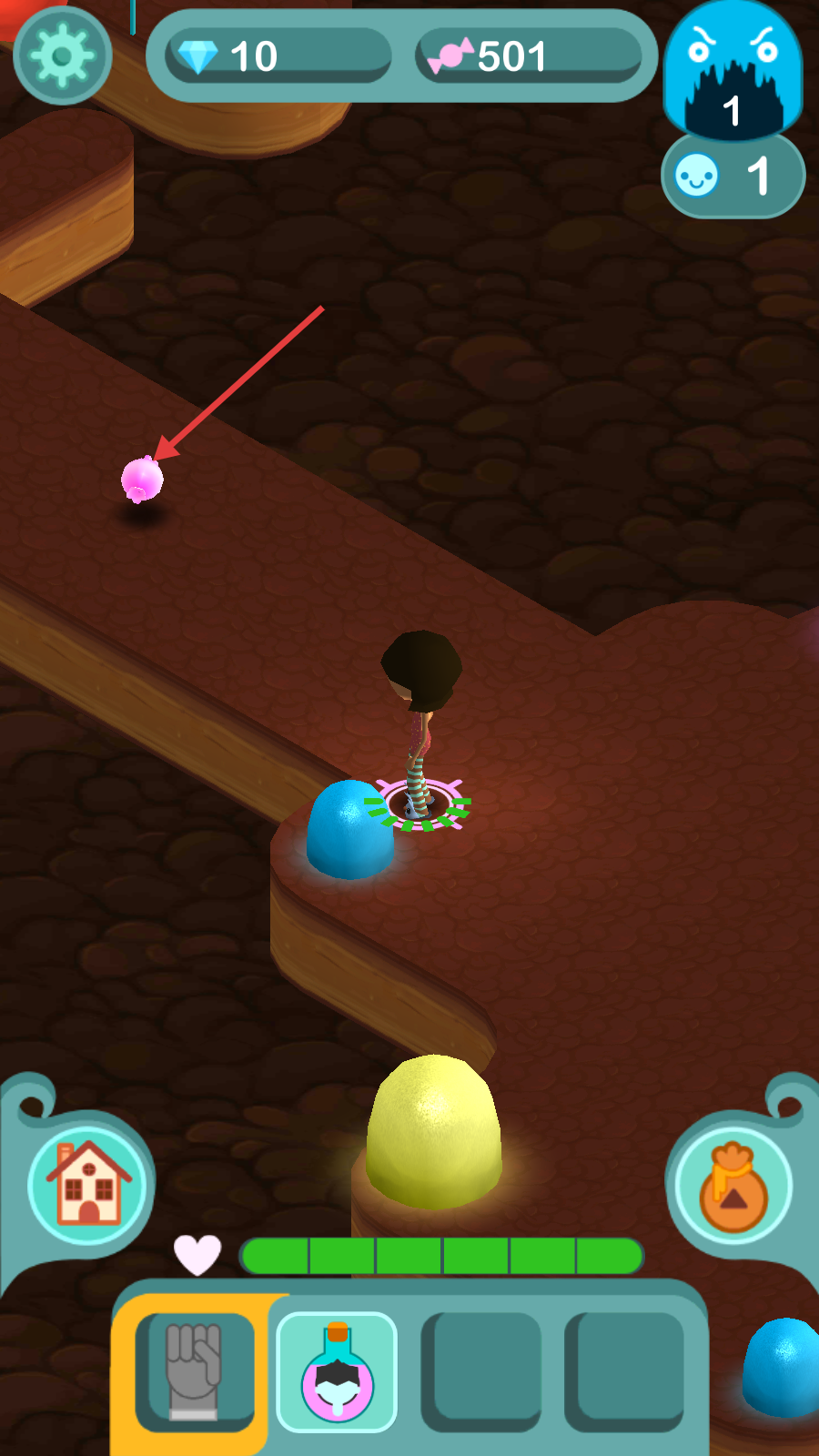 3、在场景中移动角色,收集粉色糖果道具,积累资源。