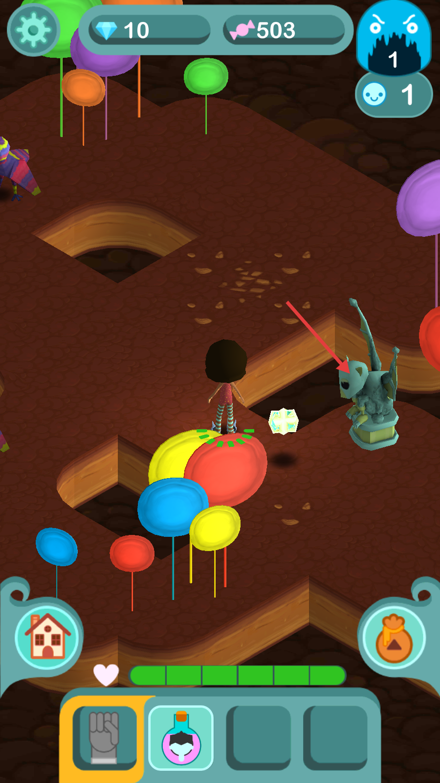 4、避开石像等场景元素的攻击,继续前进收集更多糖果,找到出口。