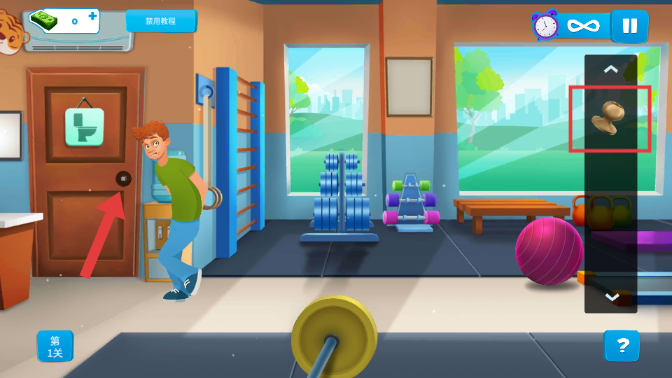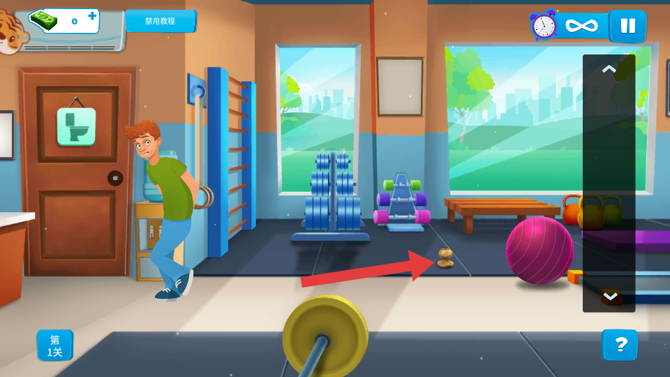 1、进入【探险大亨】第1关游戏界面,观察场景,点击箭头所指的【健身球】,将其移动到合适位置。
