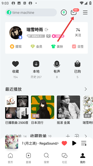 1、打开QQ音乐,进入“我的”页面,点击右上角带99+标记的【消息】图标哦。