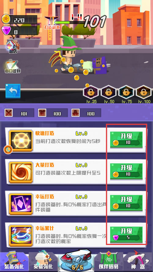 2、消耗金币或钻石,点击【升级】按钮,提升打造相关能力。