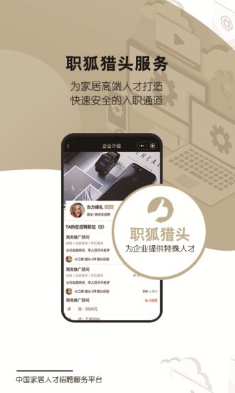 职狐,中国家居人才招聘服务平台,专注于家居领域的求职招聘app,求职者与招聘者精准匹配,高速查看,随时随地,轻松联系,让家居行业求职招聘变得如此简单。这里汇聚了全球知名家居品牌,这里了汇聚了全球家居精英人才。最nice的老板在这里等你,最自信的牛人在这里等你。每天都有海量的品牌与心仪的牛人牵手成功。请立即下载,见证奇迹的时刻即将呈现!