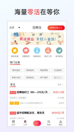招聘虫最新版拥有全国上百个城市的兼职工作,包含畅饮、服务、商务、美容等各个行业的各种职位,无论是兼职,还是全职工作,招聘虫都能轻松帮你找到。
