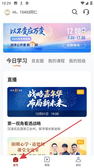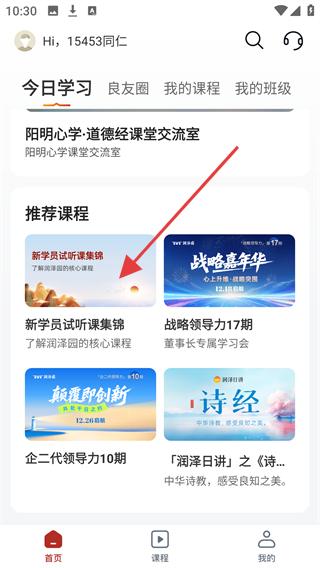 2、进入【今日学习】下的推荐课程区域,选择如【新学员试听课集锦】等课程卡片,可查看对应课程内容。