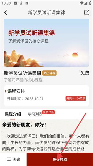 3、点击课程卡片进入详情页后,查看【课程安排】等信息,确认后点击【免费领取】按钮获取课程。