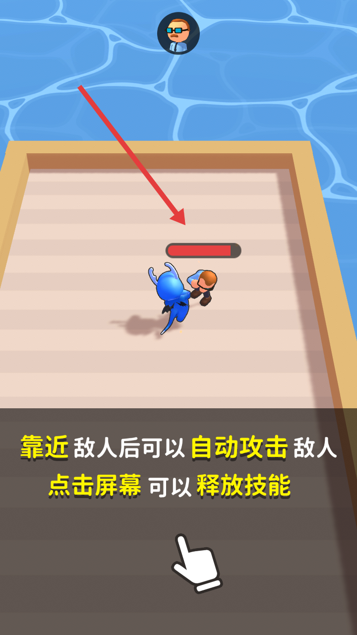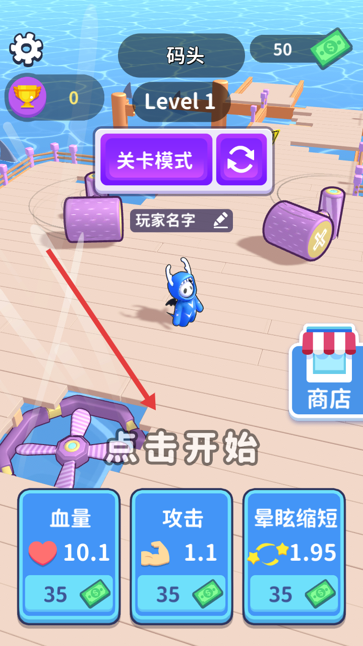 1、点击开始,选择关卡模式,操控蓝色角色在码头场景开始游戏,可升级血量、攻击、晕眩缩短属性。