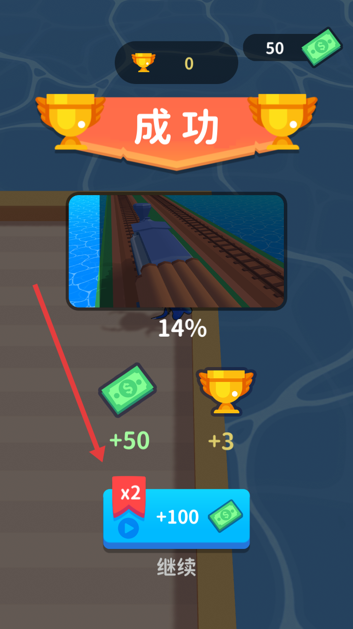 4、成功通关后,领取金币,如+50,用于升级属性或解锁新内容,点击继续进入下一关。