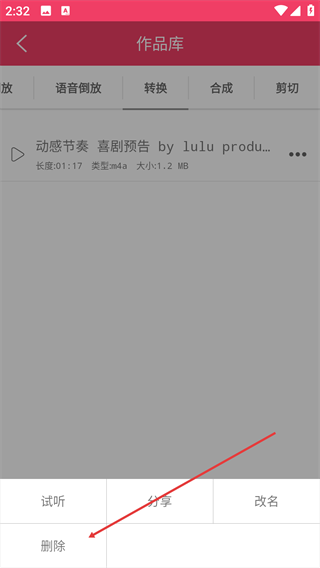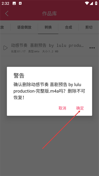 3、选择“删除”选项,触发该音频作品的删除确认弹窗。