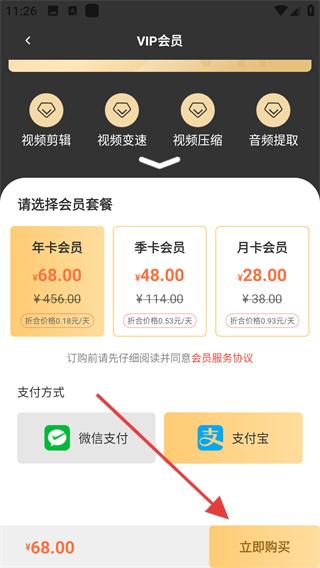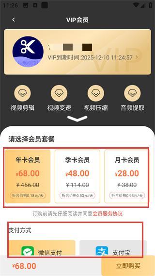 4、确认套餐与支付方式后,点击【立即购买】按钮,完成会员购买流程。