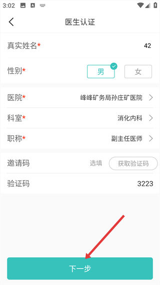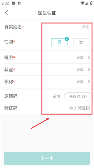3、进入【医生认证】页面,填写【真实姓名】【性别】【医院】等必填项。