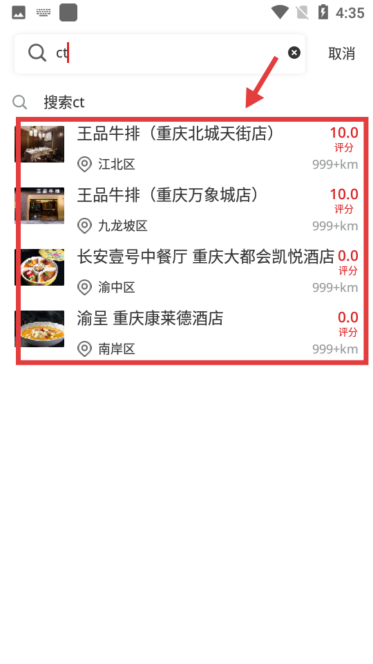 1、点击顶部搜索栏,输入餐厅名称,查看搜索结果。