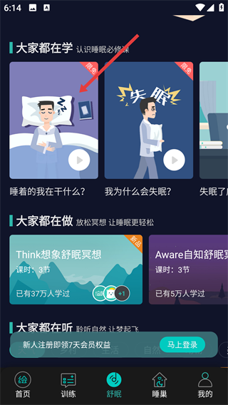 2、在舒眠板块选择感兴趣的课程,如【睡着的我在干什么】,进入课程详情页。