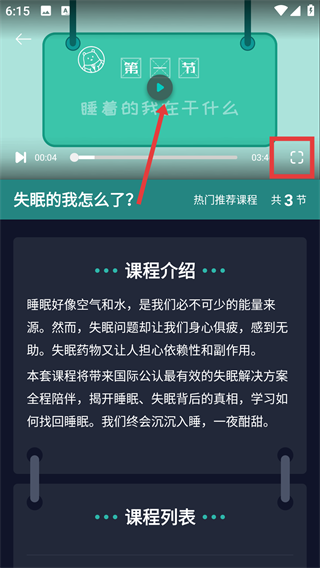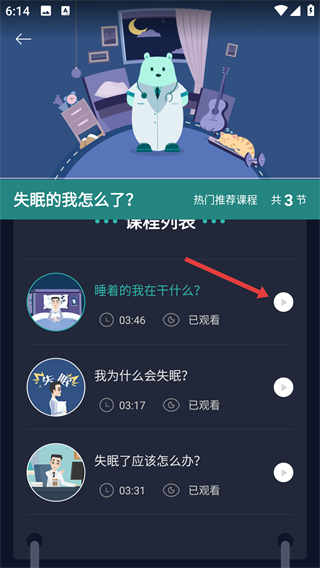 3、在课程列表中,点击课程右侧的播放按钮,即可开始学习睡眠课程内容。
