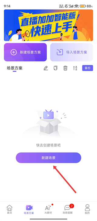 1、打开直播加加,在【场景方案】页点击【新建场景】,为直播场景搭建打好基础呢。