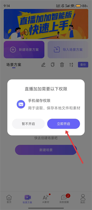 3、当弹出权限请求时,点击【立即开启】手机储存权限,这样就能顺利读取和保存直播素材啦。