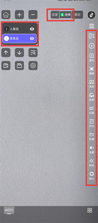 4、在场景编辑界面,可切换图层,利用右侧【美颜】等功能,还能选择【绿幕】模式,打造丰富直播效果哦。