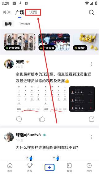 2、进入发现页面后,找到顶部的【话题】标签并点击,可切换至话题板块,浏览各类话题内容。