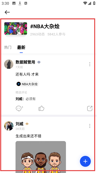 4、进入【#NBA大杂烩】话题详情页,可查看该话题下的最新动态内容,还能参与互动交流。