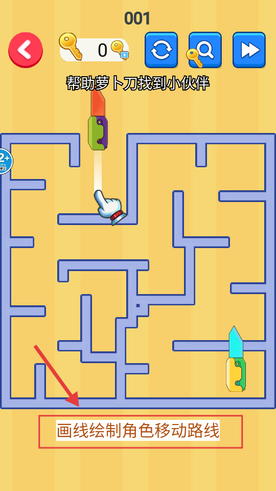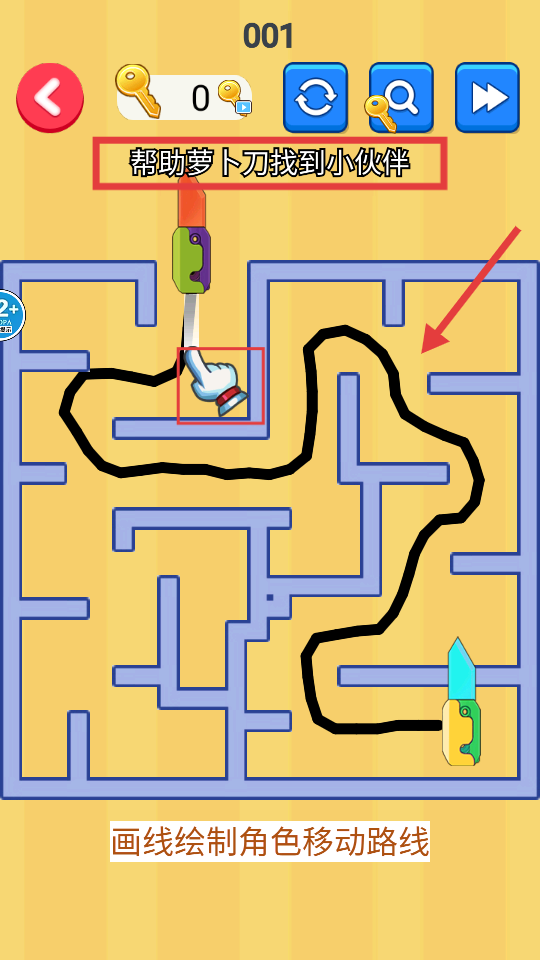 3、在【001】关卡按引导画黑色路线,连接左侧起点【萝卜刀】到右侧伙伴,避开迷宫墙壁。