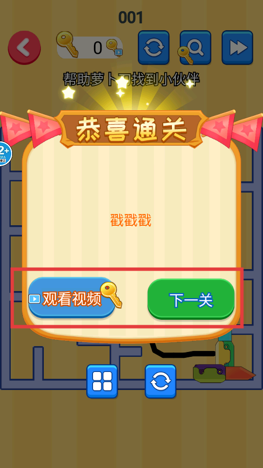 4、通关【001】后,点【下一关】继续,或点【观看视频】获取【钥匙】,界面有【恭喜通关】弹窗。