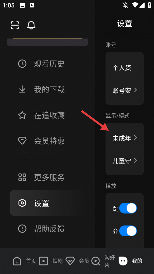 2、在“我的”页面找到【设置】,进入后选择【未成年】相关选项。