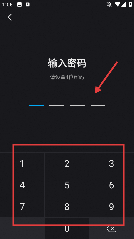 4、在“输入密码”页面,用下方数字键盘设置4位密码,完成模式开启。