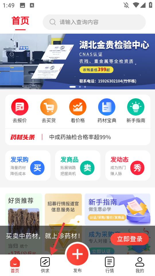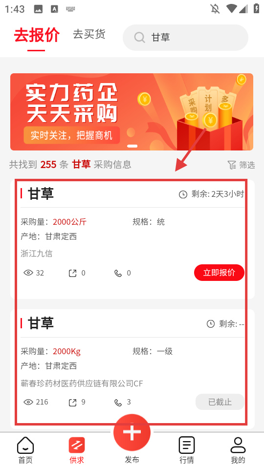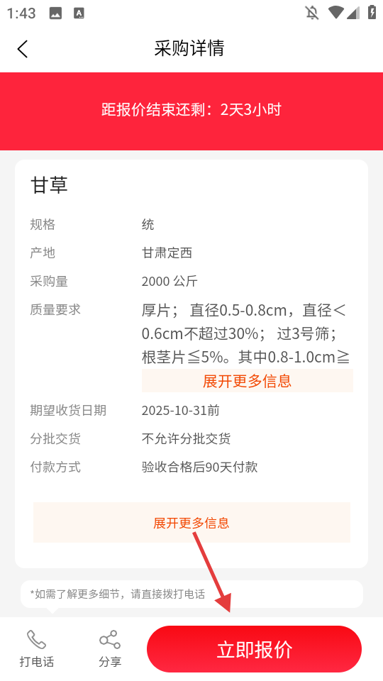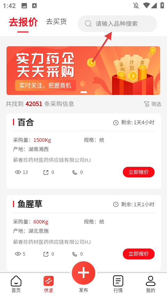4、在采购详情页点击【立即报价】,即可参与该药材的报价。