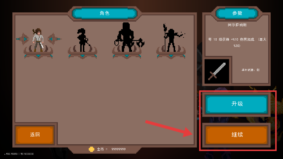 2、在角色参数界面查看【阿尔萨斯-铜斯】的伤害加成等信息,确认后点击【继续】按钮进入战斗。