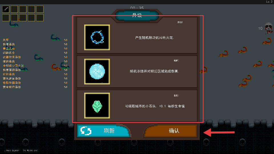 3、每关敌人变强选升级:每一关敌人都变得更强大,选物品和升级时得小心,正确决定是生存关键。