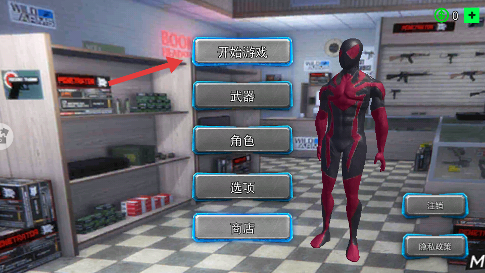 1、进入游戏主界面后,先点击【开始游戏】按钮开启冒险,界面还有【武器】【角色】等功能可后续查看。