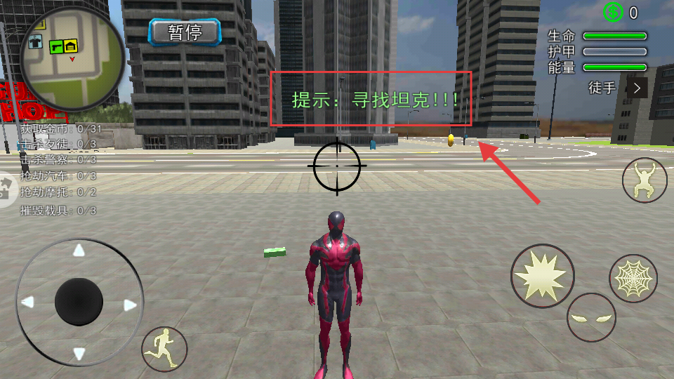 2、进入游戏后,注意上方红色提示【寻找坦克】,用左下角虚拟摇杆控制角色往箭头指向的黄色目标移动。