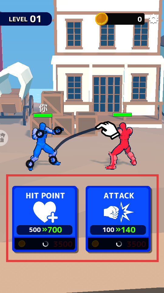 1、LEVEL-01初始界面底部有【HIT-POINT】(500→700)和【ATTACK】(100→140)升级选项,需选择提升血量或攻击力。