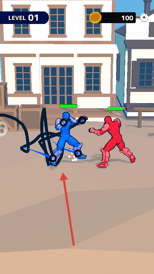 2、蓝色角色攻击红色角色,击中后金币增至【100】,跟随指引调整攻击方向保证命中。