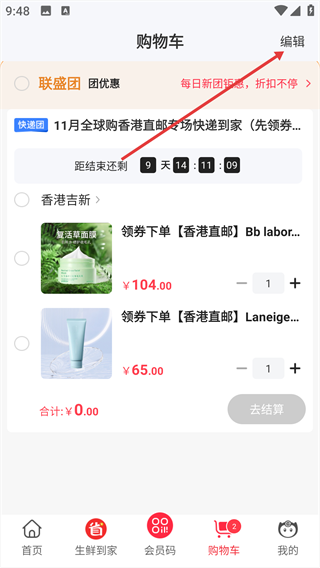 2、在购物车页面,点击右上角的“编辑”按钮,切换至购物车的编辑状态。